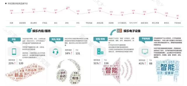 所以,买最好的音箱蹦最野的迪。手机、耳机、音响、平板电视等电子设备就成了90后娱乐至上的标配!《白皮书》也显示,在京东90后关于电子设备的品类搜索都出现了明显增长,其中音箱/音响增速最高,达到51%,其次是平板电视搜索增速达到41%。虽然在电视陪伴下长大的90后,打开电视的频率越来越少,但当平板电视的特定属性满足90后的视频消费需求时,90后也会爱上它,像具有智能、超薄、智慧屏、游戏、高清等丰富功能的智能电视,就更容易受到90后的欢迎。