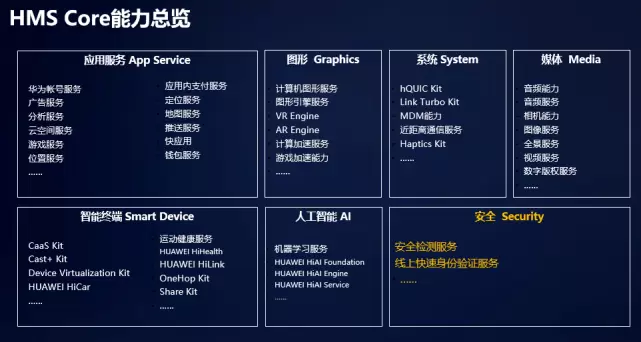 HMS Core 5.0全面开放了华为七大领域服务能力,其中安全(Security)包括FIDO和Safety Detect,未来将更全面地开放华为“芯-端-云”能力。