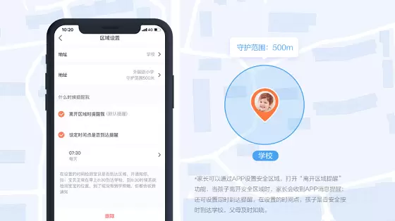 对于孩子提前离校等问题,家长可以通过萤石云视频APP设置孩子的安全活动区域,当孩子超出设定范围时,家长会及时收到APP消息提醒。同样,家长也可以设置定时到达提醒,例如,孩子正常在8点30到达学校,到8点30时手表系统将检测孩子位置,到或未到学校,都将给家长推送消息通知。