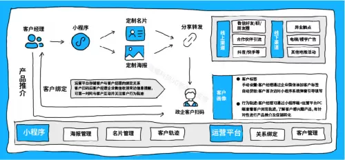 获客形式:专属二维码名片/定制海报转发,客户扫码添加客户经理企业微信,进而进行产品推介及促单转化。