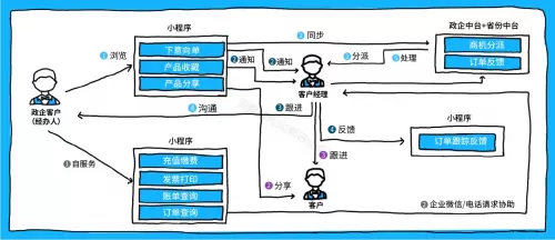 以小程序/公众号微店为入口,客户在完成关注、充值、下单、支付等操作以后,即可快速沉淀到公域流量池,再通过自动化手段将企业微信客户经理号推荐给粉丝,建立客户经理与政企客户联系,便可开展一系列私域流量经营活动。同时支持企业统一运营管理客户资产,企业员工离职后可进行客户重分配,保证客户不流失、服务不中断。