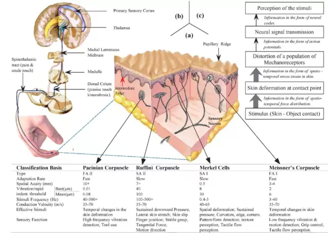 图 1. (a) 无毛皮肤切片,显示各种机械感受器的物理位置和分类;(b) 从指尖到大脑体感区的触觉信号传递;(c) 触觉信号从接触点传递到大脑过程中的功能事件,为了简单起见,信号流是单向的