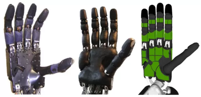 图 2. 阴影灵巧手(左)被触觉皮肤覆盖(中间),以便在多个位置提供触觉信息(右侧渲染图中突出显示的绿色区域)[3]
