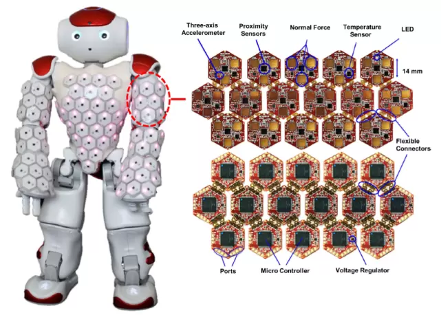图 3. NAO 类人机器人覆盖着一层多模人造机器人皮肤,提供振动、温度、力和接近信息[3]