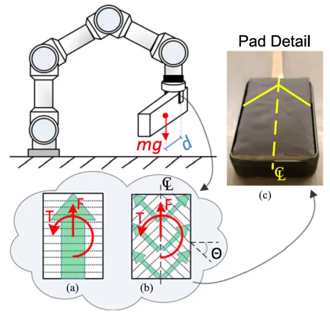图 6. 机器人从其重心处捡起物体的图画。底部:指尖覆盖 a)均匀对齐的直楔(θ=0°)和 b)楔体旋转 ±θ度的人字形图案所产生的力和扭矩。插图 c)显示了垫上壁虎材料的细节,以匹配 b)的人字形图案排列。