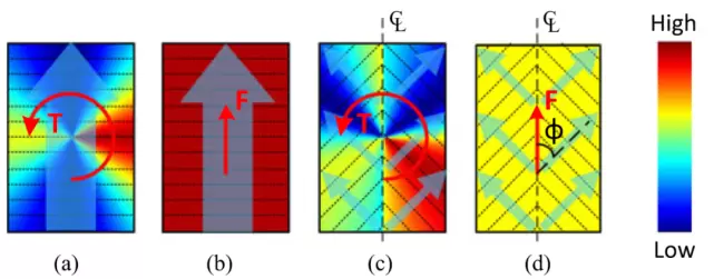 图 7. 当产生纯逆时针扭矩(a-c)或纯向上切向力(b-d)时,直线(a-b)和定向(c-d)壁虎粘合剂设计的效率图比较。半透明箭头指示壁虎粘合剂的首选加载方向