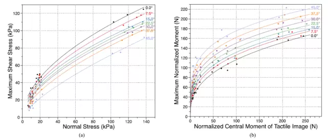 其中,P_i 表示每个压电传感器的压力,F_T 表示由手腕上的力 - 力矩传感器测量得到的切向力。图 9(a)给出了每一组测试的图案粘合剂的最大剪切应力和法向应力之间的关系。最大切向力支撑通常采用无角楔块(在这种情况下,θ=φ=0°)。拟合幂函数清楚地显示了如下趋势:随着θ的增大,最大容许剪切应力持续降低,逐渐改变了楔体的方向。此外,触觉图像的标准化中心力矩由以下公式给出: