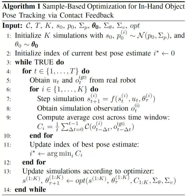 对于仿真模型 f,给定初始值 p_0、s_0、θ,只需要回放仿真中机器人的动作序列 u_t 来估计姿态。然而,由于前向模型不完善,姿态的初始值有噪声,可以通过引入观测反馈(触觉感知的一种方式)来改进姿态估计。令 D 表示机器人关节的数目,L 为它的接触传感器的数目。将观测向量 o_t 定义为机器人 q_t 关节位置配置值的串联结果,以及如下定义:R_t(位于指尖上)、感应接触的力矢量 c_t、接触面 d_t 上的平移滑移方向上的单位矢量,以及接触面 R_t 上的旋转滑移的二元方向,其中 l 表示第 l 个接触传感器。一般的手持式姿态估计问题是:给定当前和过去的观测值 o_(1:t),机器人控制器 u_(1:t),以及初始姿态 p_0,找到当前物体最可能的姿态 p_t。完整流程见算法 1。