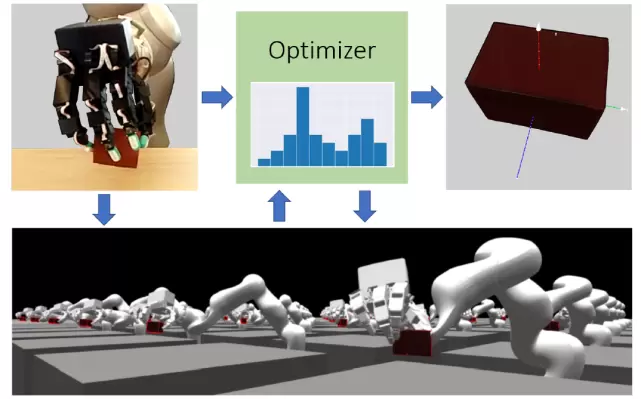 机器人能够灵巧的进行操纵,得益于其对手持物体姿势的稳健估计。然而,由于存在严重的遮挡问题,在机器人手握住和操纵物体时,很难跟踪物体的姿态。为了解决机器人操作过程中的手持式(In-Hand)目标跟踪问题,本文提出将一个 GPU 加速的高保真物理模拟器 [6] 作为前向动力学模型与基于样本的优化框架相结合,以跟踪具有接触反馈的物体姿势(如图 10 所示)的方法。该方法将机器人控制器发送到一个 GPU 加速物理模拟器中,该模拟器并行运行许多机器人的状态模拟运算,每一个都有不同的物理参数和扰动的物体姿态。将观察成本(如来自真实世界和模拟的接触反馈等)传递给基于样本的无导数优化器,该优化器定期更新所有模拟的状态和参数,以更好地匹配真实世界。在任意时刻,该方法都最终选择代价最低的仿真姿态作为当前目标的姿态估计。