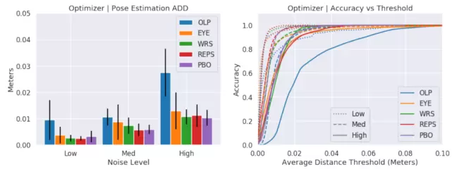 图 11 给出模拟环境中的实验结果。其中,黑色垂直线的长度表示 1 个标准偏差。优化方法通常具有较低的平均值和方差,但它们的相对排序取决于初始姿态噪声的大小。REPS 和 PBO 分别在 5.8mm 和 5.9mm 的中等噪声条件下获得了最佳的 ADD 性能。由图 11 可知,ADD 随着初始姿态误差的增加而增大,而基于优化器方法的 ADD 值相对较小。虽然 EYE 有时可以获得与使用优化器的方法相当的效果,但后者通常具有较小的误差方差和较大的误差。在中等噪声的情况下,REPS 和 PBO 的最优 ADD 值分别为 5.8mm 和 5.9mm。