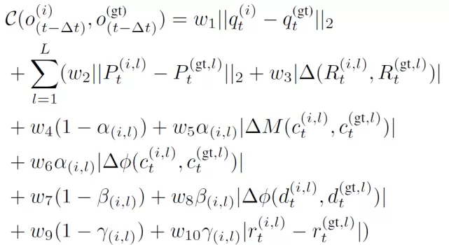 使用成本定期更新仿真及其参数,从而可以更好地与真实的机器人对象系统对齐。期望的代价函数与手持式操作的对象姿态差异相关,因此,较低的成本即对应于较好的姿态估计。本文使用的成本函数的形式如下:
