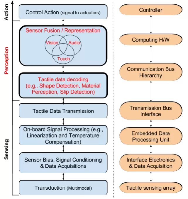 图 4. 机器人触觉传感系统的层次功能(左)和结构(右)框图 [2]