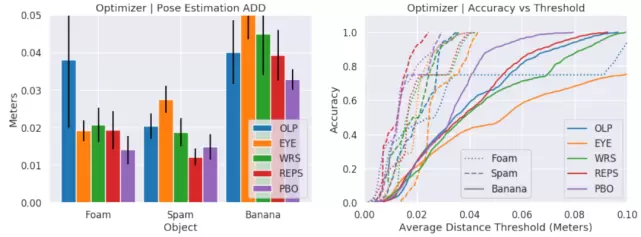对于每一个目标对象,在模拟实验和真实世界的实验中,作者给出了两种操作轨迹的演示:1)用手指抓握和手内物体旋转来拾取和放置,以及 2)相同的操作但在抓取过程中指尖断开并重新建立接触(手指转动)。演示给出了总共 24 条轨迹,用于模拟和真实世界实验的分析。在这两种操作的轨迹类型中,目标对象都会因惯性力和与工作台的推力接触而发生平移和旋转滑动。每个轨迹持续一分钟左右。假设可以在大约 30Hz 的频率下运行姿态估计算法,最终得到的每个轨迹总共大约 2k 帧。除了本文建议的优化器(WRS、REPS、PBO),作者还评估了以下两个基线方法:开环(Open Loop,OLP)和标识(Identity,EYE)。OLP 使用 1 个模拟来跟踪对象的姿势。EYE 使用一组有噪声的初始姿态进行初始化,并且总是选择成本最低的模拟姿态,但它不执行任何重新采样或优化器更新处理。最后,本文使用平均距离偏差(Average Distance Deviation,ADD)作为评估指标。ADD 计算真实姿势和预测姿势的对象点云中相应点之间的平均距离。