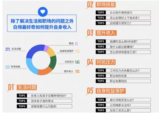 白领作为社会发展的中坚力量,在对抗工作压力的同时,也肩负着家庭的重担。百度搜索大数据显示,生活问题、职场技能、提升收入、对抗压力、自身权益保护是白领最关心的五大领域。其中如何买保险、办公软件使用技巧、跳槽时怎么和HR谈薪、工作压力大失眠怎么办、被公司裁员怎么办等问题热度最高,白领的生存压力之大可见一斑。