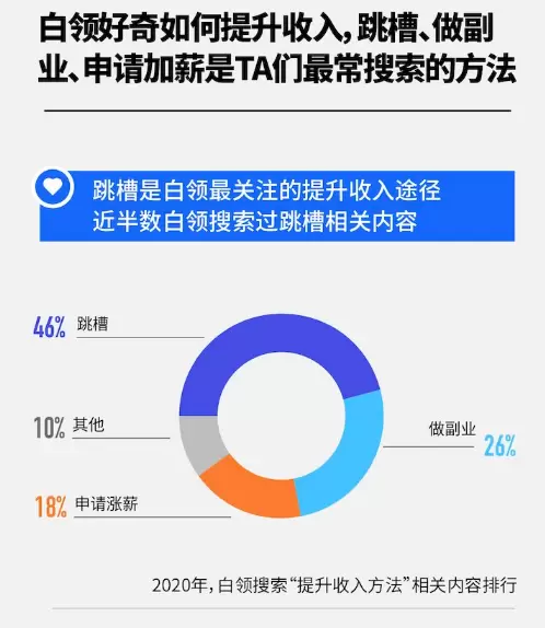 提升收入是提升白领生活质量的重要办法,也是白领最关注的领域之一。百度搜索大数据显示,2020年,46%的白领期望通过跳槽来提升收入水平,26%的白领好奇做什么副业能赚钱,18%的白领倾向于内部申请加薪。