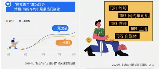做副业成为今年的大趋势之一。百度搜索大数据显示,2020年,上班炒股和副业的相关搜索环比上升366%和88%,“斜杠青年”成为趋势。最受欢迎的五大副业分别是炒股、网约车司机、微商、主播和自媒体。