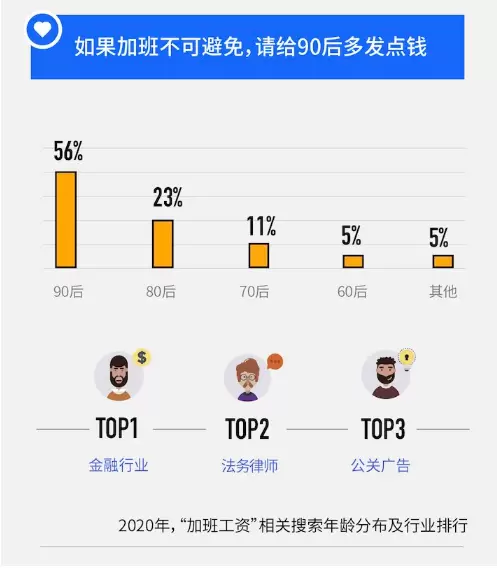 此外,在“996工作制”流行的当下,金融、法务律师、公关广告等加班较多行业的白领也在频繁搜索加班工资的计算方法,其中90后最为关注,占比达56%。