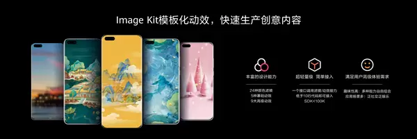 同时,华为还通过Image Kit把主题的能力开放出来,原来需要写几千行代码才能实现的效果,集成Image Kit后只要引用两三行代码、进行简单的参数设置即可实现更加炫彩的创意动效,助力开发者快速生产创意内容。