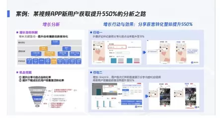 以视频平台增长为例,在增长分析的过程中,平台会先确定目标,对目标进行逻辑拆解后,规划行动机会。在视频平台的增长行动中,灯塔增长引擎会采取外露评论样式使得分享内容点击率提升,并增加deeplink,同时用户在首次打开即直接展示分享内容对应视频,将新用户观看视频激活率大幅提升。