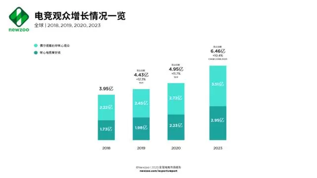 近日,数据分析公司Newzoo发布了《2020全球电子竞技市场报告》,数据显示,2020年,全球电竞观众将增至4.95亿,其中,核心电竞爱好者2.23亿,同比增长2500万,预计将以11.3%的复合增长率(2018- 2023 年)在 2023 年达到2. 95 亿,而中国将成为这一数字贡献最大的国家,成全球最大电竞市场!