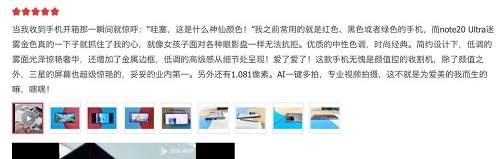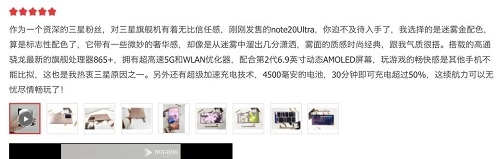 最近有很多网友在入手了三星GalaxyNote20系列手机后发表使用感受:“哇塞,这是什么神仙颜色!迷雾金真的一下子就抓住了我的心”、“配合第2代6.9英寸动态AMOLED屏幕,三星Note20 Ultra玩游戏的畅快感是其他手机不能比拟的”、“ 非常漂亮,镜头突出偏多。后盖玻璃手感非常棒”、“不管是手机的颜值,还是性能和功能设计,三星Galaxy Note20系列都做到了有调性而不落俗套”,而在这些认可背后,是三星多年来持续不断的创新。