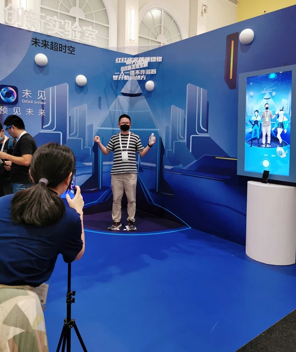 “未来超时空”探索区展示了“未见”这款创新应用给用户带来的AR交互新体验。现场将平行世界的未见星系1:1现场还原,打造沉浸超感知体验,将掌上虚拟场景延展到现实中。在这里,用户可以体验到AR和VR两种创新交互形式。在未见的平行世界里,你可以在星空下与异次元男孩女孩、宠物狗狗一起互动,完成未见星球之旅。现场还能与他们拍照合影,为这段神奇的AR之旅留下印记,动动手指,趣味无穷。