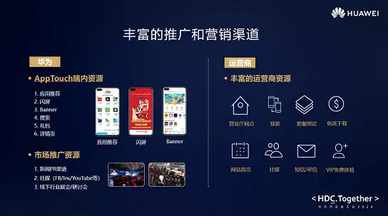 整合华为AppTouch和全球运营商的资源,包括华为AppTouch客户端流量资源、海外运营商资源、互联网营销推广等等,共同助力推广引流。