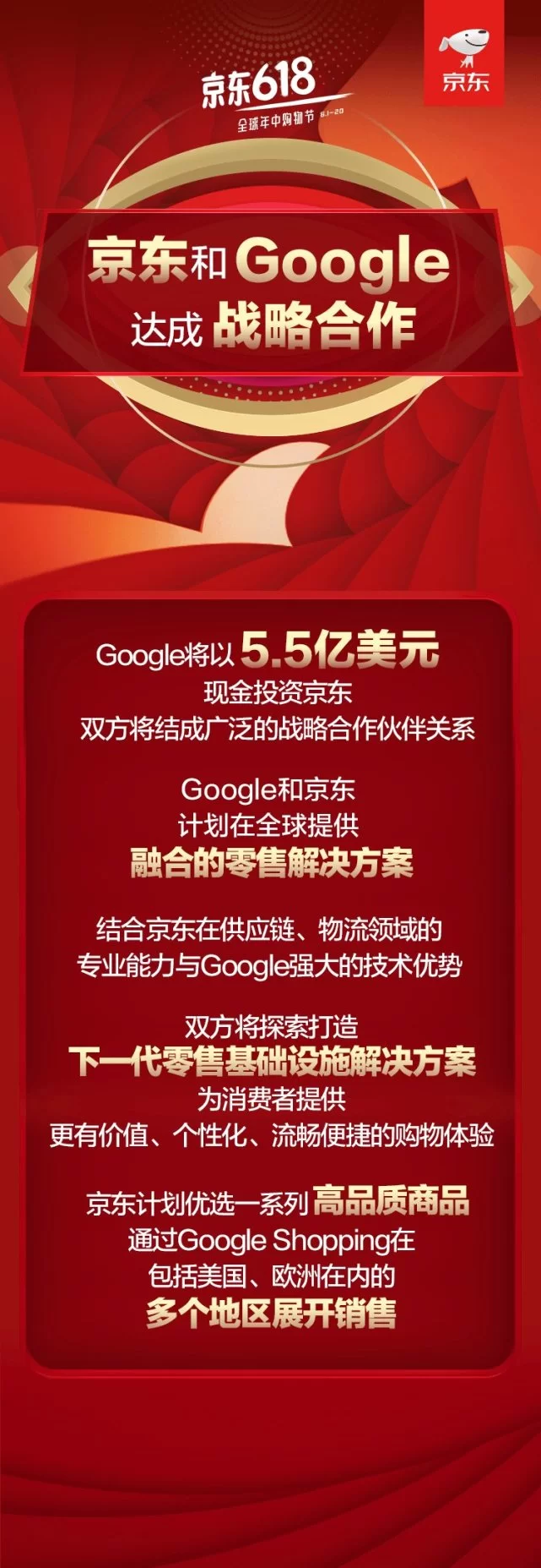 6月18日,京东集团和谷歌宣布,谷歌将以5.5亿美元现金投资京东,双方将结成广泛的战略合作伙伴关系。
