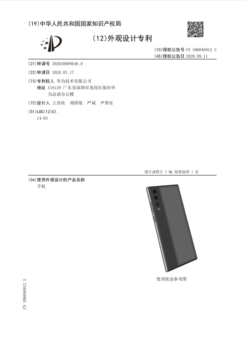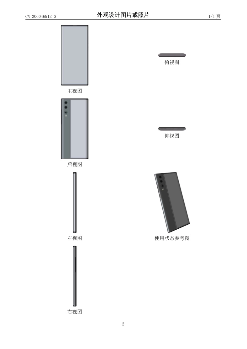 据 LETSGODIGITAL 报道,华为技术有限公司于2020 年 3 月中旬向 CNIPA(中国国家知识产权局)申请了一项全新的外观设计专利。专利中的设备有点像 Huawei MateX,不过屏幕并非折叠设计,而是类似环绕屏设计。目前尚不清楚华为是否真正打算发布一款环绕式智能手机