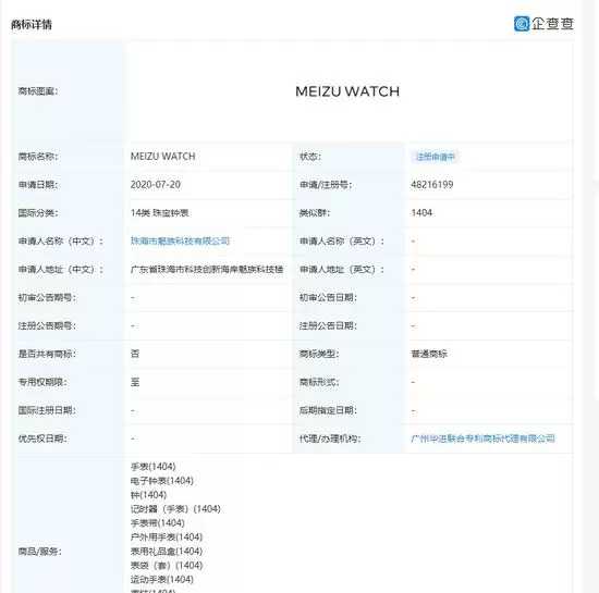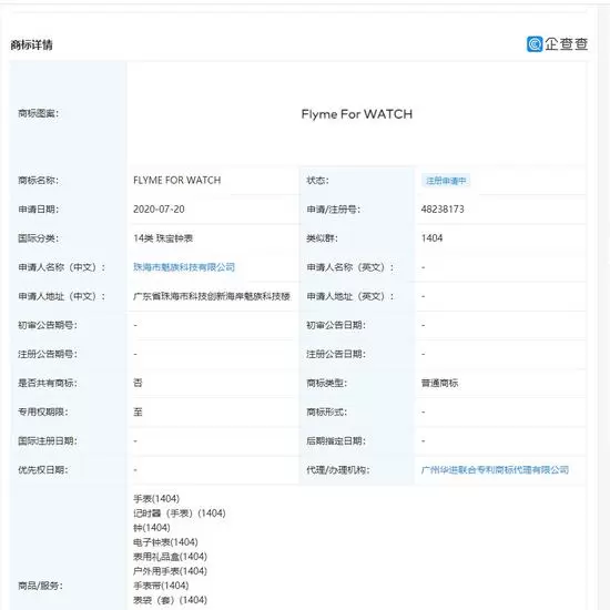 企查查 App 显示,魅族科技有限公司于 7 月 20 日申请注册两件新商标,商标名称分别为 “MEIZU WATCH”及 “FLYME FOR WATCH”,证实了该公司将推出一款智能手表产品。