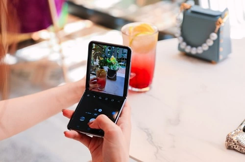 折叠屏幕拍摄时,取景框如何呈现,三星Galaxy Z Flip 5G采取了自适应分屏模式这一解决方案。当你将三星Galaxy Z Flip 5G折叠到一定角度,以铰链部分为分界,上部分屏幕可完全显示为取景框,下部分为各种操控选项。这样在拍摄时,既能为用户带来更好的预览体验,在操作的时候也更加方便。不只控制拍摄,在这一模式下,你还可以同时查看图库图片,以及进行图片分享。