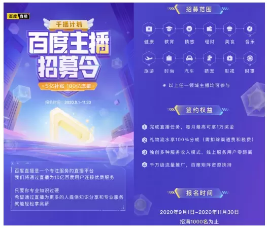 为扶持直播创作者成长,百度直播从9月1日启动了“千播计划”,拿出5亿补贴和100亿流量,扶持1000名优秀的服务者主播,囊括健康、教育、情感、理财、美食、旅游、时尚、汽车、萌宠、影视等众多领域。随着更多领域的优质创作者冒头,距离“人们有多少问题,百度直播就有多少解决问题的资源和方案”的目标将一步一步拉近。