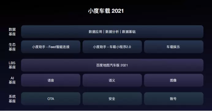 据介绍,小度车载2021包括五大数字化基座:生态基座、AI基座、LBS基座、数据基座和系统基座。其中,生态基座包括高度信息流化和丰富的生态内容和服务,这些服务天然适配车载场景,可以形成全语音闭环,服务深度直达;AI基座,是将百度强大的AI能力最极致的状态应用到车里,例如,语义方面,百度首次推出车载百度搜索,将百度搜索搬到了车内,只要百度能搜到的,已经有超过50%在车内能够获得一句话的精准回答;LBS基座,基于百度地图汽车版的强大能力打造中国车载领域最丰富的LBS服务基础设施;数据基座,基于百度在大交通领域和大数据的积累,所形成的一套完整的专为汽车和出行服务的数据平台,通过对车内车外云端数据整合和大数据分析,实现数据驱动变革;系统基座将提供未来智能汽车所最需要的底层系统保障,其中包括系统安全保障,向上升级所必须的OTA通道等等。