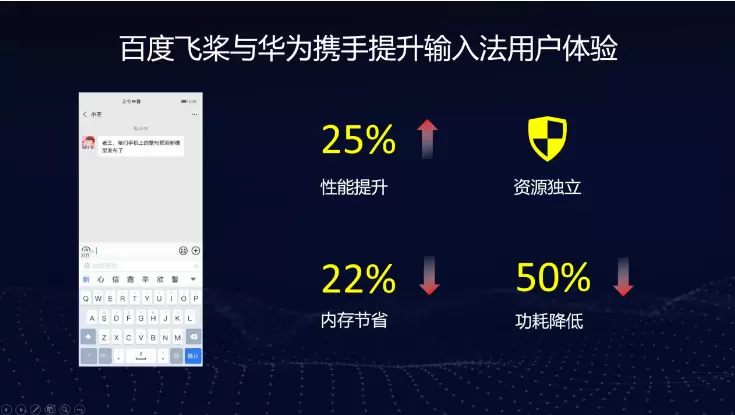 与华为的合作正是其中的一个典型。在去年七月的百度AI开发者大会上,百度飞桨与华为达成合作,双方在硬件底层打通,可以为端侧AI提供强劲算力,这一点在输入法应用上体现得特别明显:性能提升25%,内存节省22%,功耗降低50%,而且表现更加稳定,不会受到CPU的负载影响。