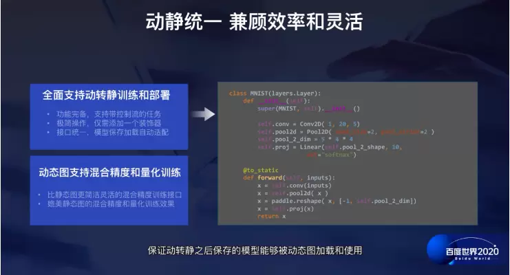 在现场,马艳军还带来飞桨开源框架的两大升级。首先是提供了更加完备和性能更优的动态图功能,以及更全面的动态图转静态图运行功能,在开发上实现“动静统一”。