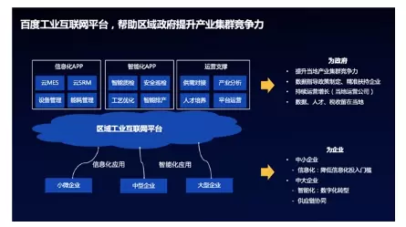 百度工业互联网平台解决企业、产业链和区域政府三方面的问题,成为智造新引擎,推动工业制造领域的产业智能化升级。