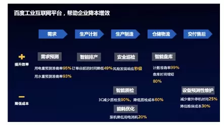 首先对企业来说,百度工业互联网平台通过工业智能让每个环节都能实现降本增效。在需求环节,用历史数据预测需求,从而更有针对性地安排生产,减少浪费;在计划环节,用智能排产算法大大提高订单准时交货率,缩短订单生产时间,减少物料库存时间;在制造环节,用AI质检技术可以达到降低质检成本60%以上,缓解了招工难、培训难、留人难等问题;在仓储物流环节,百度在一汽物流使用视觉技术,实现了汽车的无人机计数盘点,准确率达到99%以上,盘点时间相比人工缩短了80%。