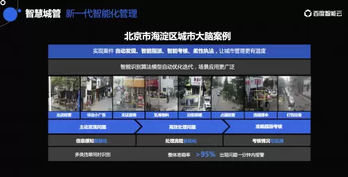 在城市管理方面,百度智慧城市通过一网通管、案件智能处理等服务,优化案件的发现、审核、立案、处置、结案等环节,改善传统网格化管理的流程长、耗费人力等问题。比如百度参与建设的北京海淀区城市大脑,能够智能识别出店经营、非法广告、无证游商、乱堆物料、沿街晾晒等十几种城市管理违规事件,且识别准确率超过 85%,误报率低于 15%。通过自动发现、智能指派、智能考核以及柔性执法,使城管案件处置效率和市民满意度均得到提升。