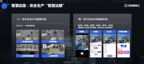 在智慧应急方面,百度智慧城市还推出了安全生产“智慧法眼”,利用视觉识别对人的不安全行为和物的不安全状态进行智能识别,推动网上执法、视频巡查、电子文书、智能识别、智能装备等新工作模式,实现了对安全生产的全时智能监控,大大减少人力检查的成本,同时也降低事故发生的概率。