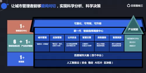 这套架构方案分为三部分:底层是智慧城市新基建,包含人工智能云和百度城市大脑,其中人工智能云具备安全、稳定、自主可控的优势,基础云还通过百度的昆仑AI芯片提供人工智能算法需要的算力,以及百度超级链提供区块链底层能力。百度城市大脑包括城市感知中台、知识和数据中台、AI中台和智能交互中台;中间应用层则是基于城市大脑,对城市管理、应急管理、公共安全、智慧交管、政务服务、智慧旅游等6大场景持续赋能。同时通过飞桨、昆仑AI芯片、鸿鹄语音交互芯片等为企业提供AI应用的基础技术支撑和AI人才培养等服务;让企业开发者可以快速获得业内效果最好、研发成本最低、技术最先进、且全面自主可控的AI创新工具与服务,协助各地实现产业经济发展新动能。