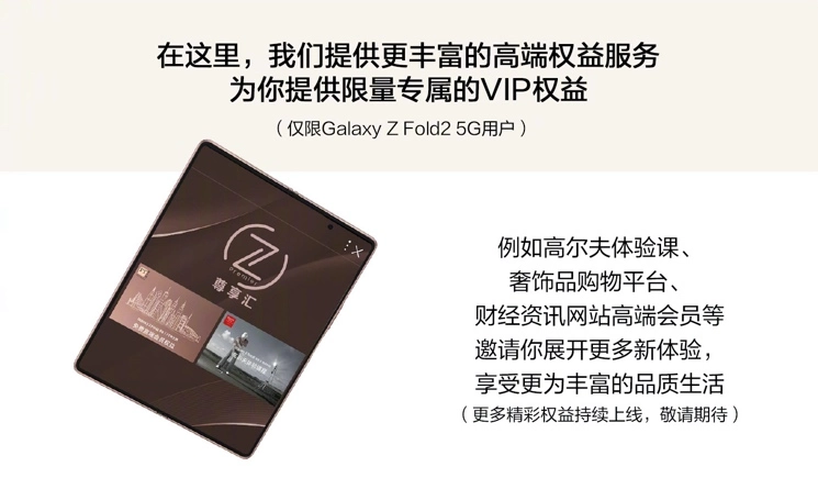 为了能够给用户提供更多丰富的服务,让用户尽情享受生活的惊喜,三星携手众多合作伙伴,为三星Galaxy Z Fold2 5G的用户提供了更加多元、更具品质、更加高端的专属VIP权益。比如,为用户提供高尔夫球体验课,帮助用户更优雅地融入精英社交圈;推荐奢侈品购物平台,帮助用户挑选心仪的物品,彰显自身的高端格调;提供财经资讯网站高端会员,时刻掌握变化莫测的商业趋势。同时Z尊享汇也会根据消费者的需求以及潮流的趋势,不断更新升级,为消费者提供更多权益。