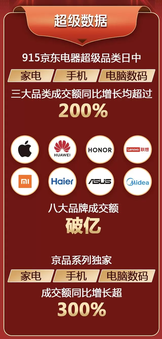 今年915京东电器超级品类日再次成为各大品牌强势增长的增量场:Apple、华为、荣耀、联想、小米、海尔、华硕以及美的等八大品牌成交额破亿。