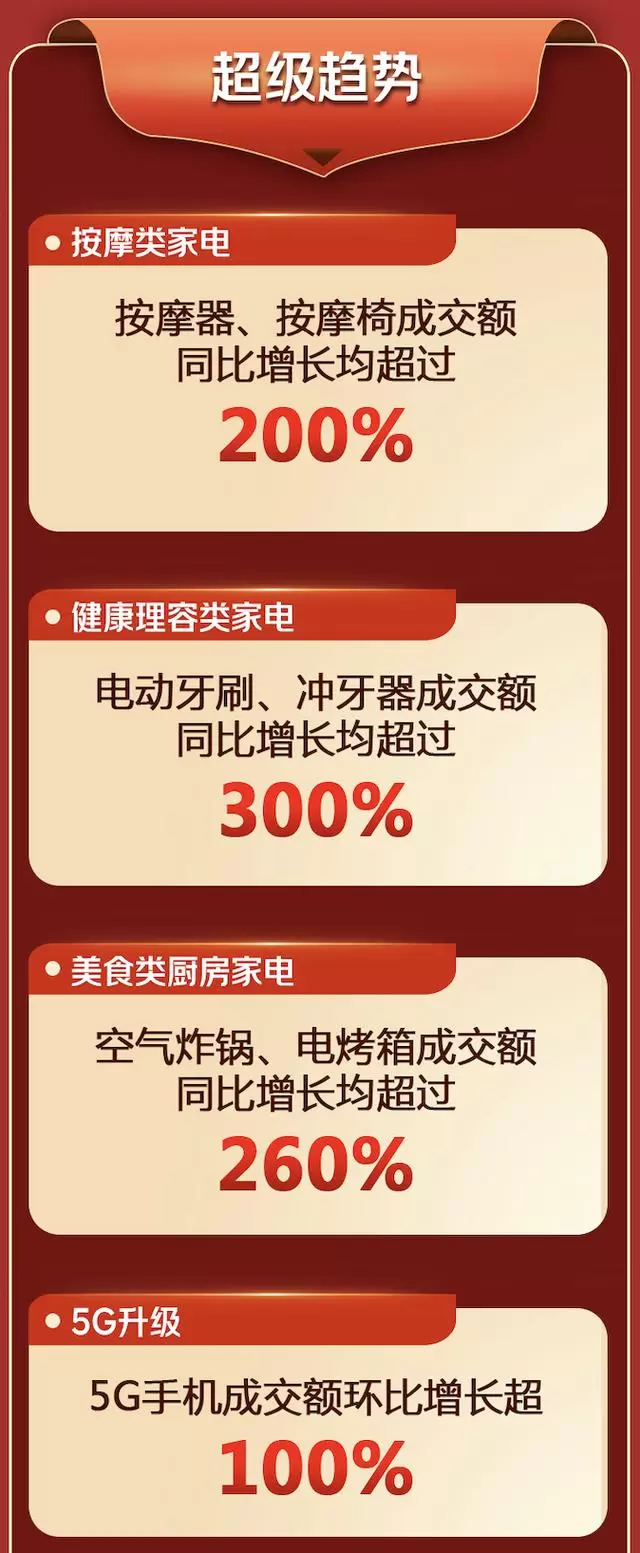 围绕办公和居家两大场景,家电、手机和电脑数码中许多细分品类也节节攀升,充分展现了广大用户对品质生活的热爱与追求。家电方面,首发90日内家电新品成交额环比30日均增长超过5倍;按摩类家电中的按摩器、按摩椅成交额同比增长均超过200%;健康理容类家电中的电动牙刷、冲牙器成交额同比增长均超过300%;美食类厨房家电中的空气炸锅、破壁机、电烤箱、养生壶等成交额同比增长均超过260%。手机方面,5G手机成交额环比增长超100%。电脑数码方面,电脑数码企业业务成交额是去年同期的12倍,家庭投影成交额同比增长超6倍,无人机成交额同比增长9倍。