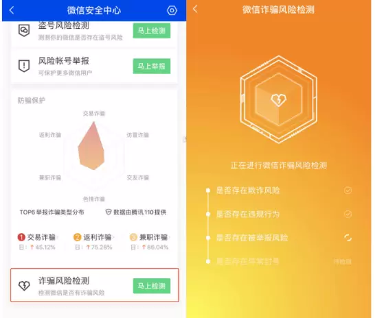 (图:腾讯手机管家账号安全保护功能检测账号诈骗风险)