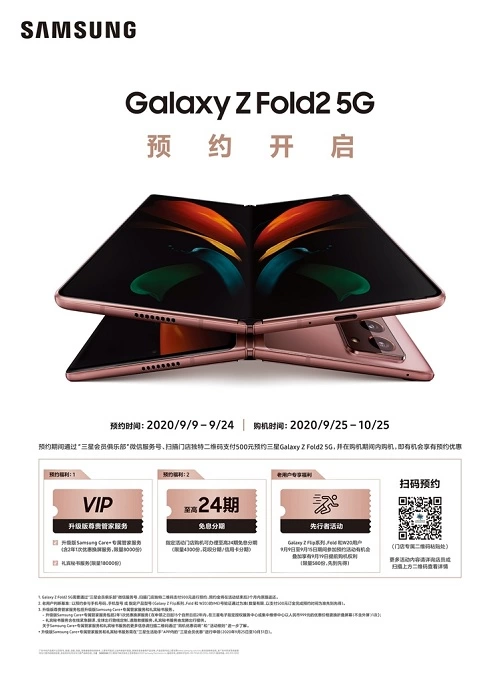 目前,三星GalaxyZFold2 5G正在火热预定中,即日起至9月24日,消费者通过指定线上及线下渠道成功预约三星Galaxy Z Fold2 5G即有机会享受升级版尊贵管家服务,包括2年内1次优惠换屏服务在内的升级版Samsung Care+专属管家服务和礼宾秘书服务。此外,购机顾客均可享受至高24期免息分期。凡购买Galaxy Z Fold 2 5G系列产品的用户均可享受三星为Galaxy Z系列产品用户所打造的“Z尊享汇”VIP服务。