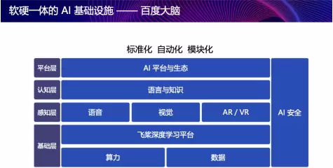 作为国内投入最早、技术最强、布局最完整的人工智能领军企业,百度既是AI基础设施的建设者,也是AI技术及应用创新的引领者和推动者。百度AI多年技术积累和产业实践的集大成——百度大脑,即是百度打造的AI新型基础设施。其基础层包括算力、数据技术,以及以飞桨深度学习平台为核心的算法平台,感知层包括语音、视觉、AR/VR等技术,认知层是语言与知识技术。同时,还拥有纵贯各层完整的安全体系,以及面向开发者和合作伙伴的AI平台与生态。通过开源开放,百度大脑的核心技术得以与社会各界共享。