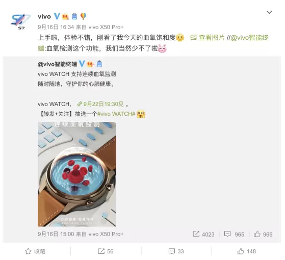 在vivo WATCH智能手表的前期预热信息中,有一个细节值得关注:官方预热海报中提到了vivo WATCH的血氧监测功能,并且是连续血氧监测。血氧饱和度对用户来说是呼吸循环的重要生理参数。不过,目前市面上有些智能手表只能提供单次血氧监测,无法获得全天数值。而vivo WATCH或许可以实现全天候的监测,更全面。
