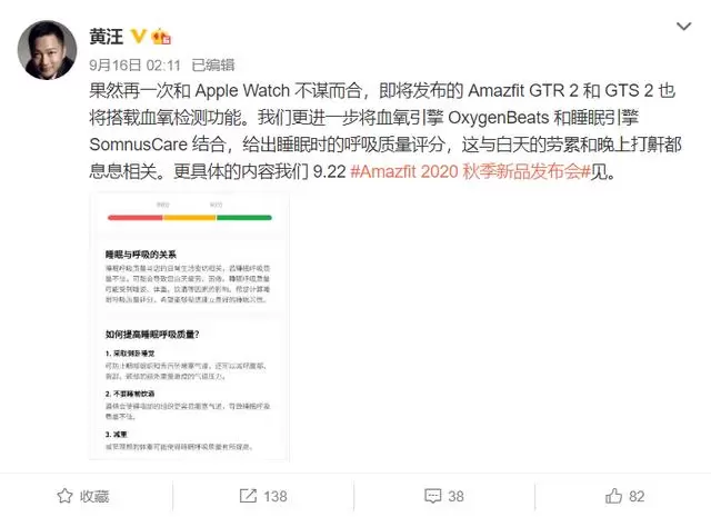 华米科技CEO黄汪还在微博上表示,华米新品会将更进一步将自家的血氧引擎OxygenBeats和睡眠引擎SomnusCare结合,为睡眠呼吸质量评分,这与白天的劳累和晚上打鼾都息息相关。OxygenBeats血氧引擎和SomnusCare睡眠引擎是华米最新发布的 AI 生物引擎,这两个引擎的结合可以让可穿戴设备从睡眠状态判定和⾎氧饱和度检测两个维度深度分析,实现对睡眠呼吸暂停综合征的智能识别,可有效帮助用户识别这一危害健康的"隐形杀手"。