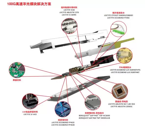 光通信行业,尤其是高速率光模块,非常注重器件的高性能和稳定品质。作为通讯与数据通讯领域的核心部件,激光二极管、光学组件 (OSA)、光模块等光学组件在信息的传输、 收集、显示、储存和处理中都扮演着至关重要的角色。光模块中的多个光学组件,如光纤阵列单元、耦合透镜、光隔离器,准直器,耦合器和分离器,以及其它聚焦和切换光器件必须精确校准,并持久相互粘接才能确保长期可靠性。同时,每个元器件高度集成,而在整个生产过程中经过多个工艺流程,会使用多种粘合剂、导热材料,这对专业性要求非常高。