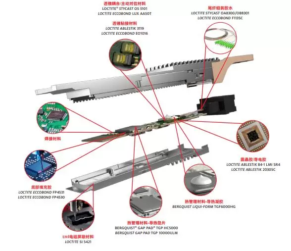 光模块在使用过程中通常是7*24小时全天候无间断运行,尤其对于价格高昂的100G以及400G高速率光模块而言,更要求设备能够长期、稳定、高效的运作。因此要求粘合剂具有高粘接强度、低固化收缩率、低CTE等关键特性,以满足在高低温及冷热循环等严苛环境下,避免因为化学品的膨胀或收缩对光模块产生应力,从而为设备提供稳定、可靠的粘接。汉高展示的新品是LOCTITE® ABLESTIK 3119具有极低的收缩率,以及100度低温固化性能;LOCTITE ECCOBOND EO1016在金属和塑料,尤其是镍和FR4 等难以粘接的基材上,具有良好的粘接力。